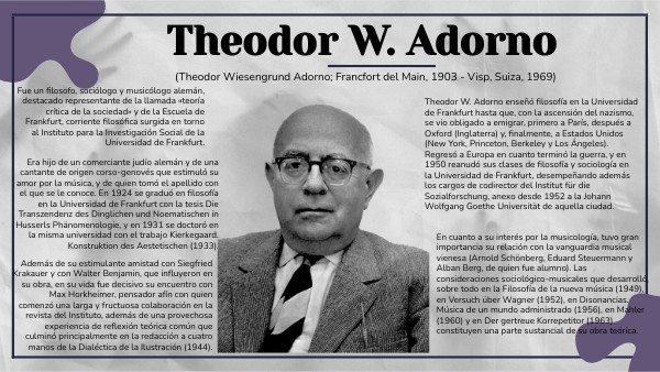 Fue un filosofo, sociólogo y musicólogo alemán, destacado representante de la llamada «teoría crítica de la sociedad» y de la Escuela de Frankfurt, corriente filosófica surgida en torno al Instituto para la Investigación Social de la Universidad de Frankfurt.