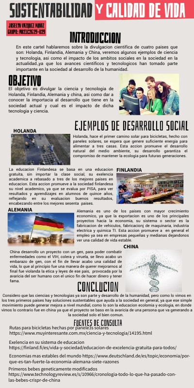 En este cartel hablaremos sobre la divulgacion cientifica de cuatro paises que son: Holanda, Finlandia, Alemania y China, veremos algunos ejemplos de ciencia y tecnologia, asi como el impacto de los ambitos sociales en la sociedad en la actualidad.,ya que los avances cientificos y tecnologicos han tomado parte importante en la sociedad al desarrollo de la humanidad.