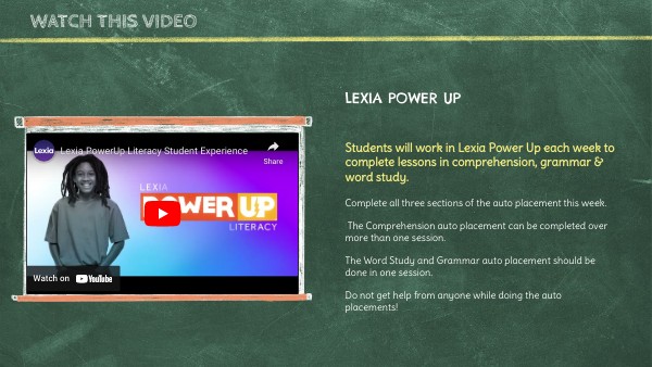 Students will work in Lexia Power Up each week to complete lessons in comprehension, grammar & word study.