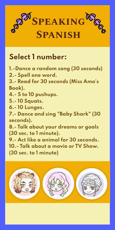1.-Dance a random song (30 seconds) 2.- Spell one word. 3.- Read for 30 seconds (Miss Amo´s Book). 4.- 5 to 10 pushups. 5.- 10 Squats. 6.- 10 Lunges. 7.- Dance and sing "Baby Shark" (30 seconds). 8.- Talk about your dreams or goals (30 sec. to 1 minute). 9.- Act like a animal for 30 seconds. 10.- Talk about a movie or TV Show. (30 sec. to 1 minute)