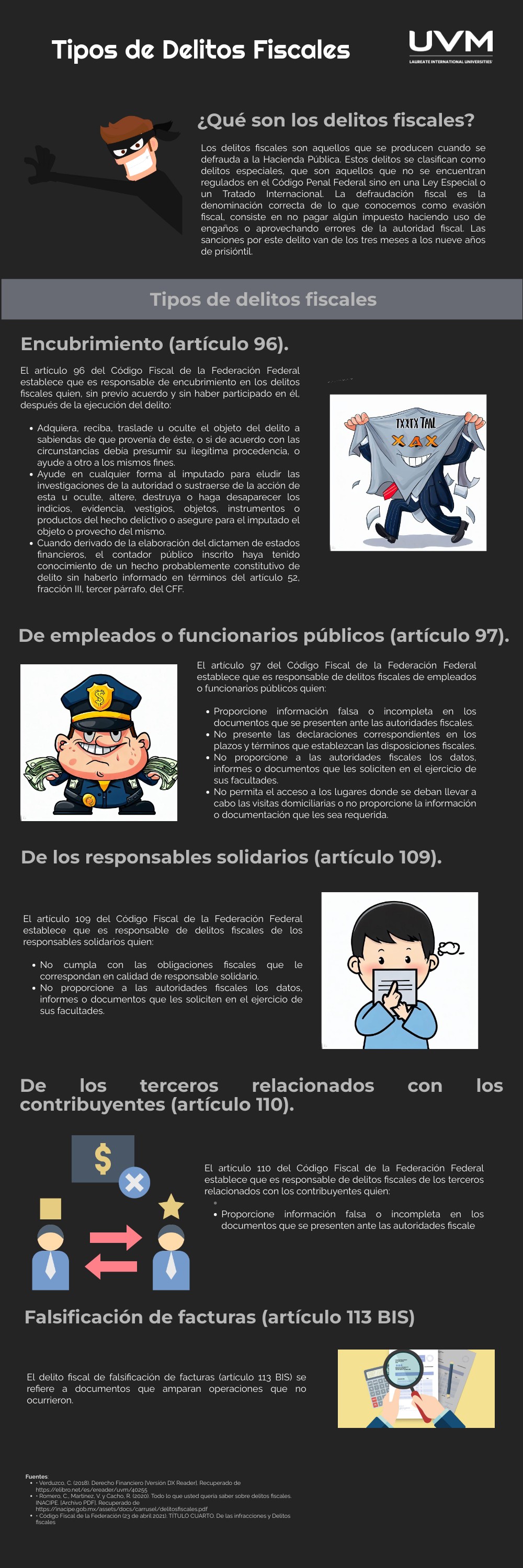 - • Romero, C., Martínez, V. y Cacho, R. (2020). Todo lo que usted quería saber sobre delitos fiscales. INACIPE. [Archivo PDF]. Recuperado de https://inacipe.gob.mx/assets/docs/carrusel/delitosfiscales.pdf