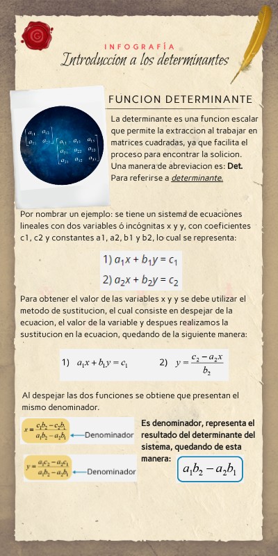 La determinante es una funcion escalar que permite la extraccion al trabajar en matrices cuadradas, ya que facilita el proceso para encontrar la solicion. Una manera de abreviacion es: Det. Para referirse a determinante.