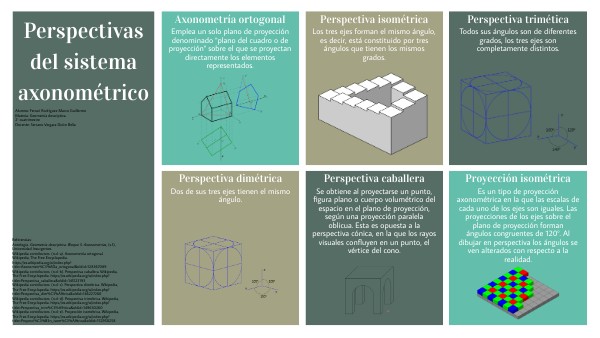 Referencias:Antología. Geometría descriptiva. Bloque 5. Axonometrías, (s.f.), Universidad Insurgentes.Wikipedia contributors. (n.d.-a). Axonometría ortogonal. Wikipedia, The Free Encyclopedia. https://es.wikipedia.org/w/index.php?title=Axonometr%C3%ADa_ortogonal&oldid=128367089Wikipedia contributors. (n.d.-b). Perspectiva caballera. Wikipedia, The Free Encyclopedia. https://es.wikipedia.org/w/index.php?title=Perspectiva_caballera&oldid=145123193 Wikipedia contributors. (n.d.-c). Perspectiva dimétrica. Wikipedia, The Free Encyclopedia. https://es.wikipedia.org/w/index.php?title=Perspectiva_dim%C3%A9trica&oldid=146227260 Wikipedia contributors. (n.d.-d). Perspectiva trimétrica. Wikipedia, The Free Encyclopedia. https://es.wikipedia.org/w/index.php?title=Perspectiva_trim%C3%A9trica&oldid=149630260 Wikipedia contributors. (n.d.-e). Proyección isométrica. Wikipedia, The Free Encyclopedia. https://es.wikipedia.org/w/index.php?title=Proyecci%C3%B3n_isom%C3%A9trica&oldid=152950258