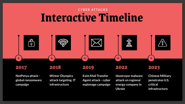 The 2018 Winter Olympics attack, which was a cyber sabotage operation that targeted the IT infrastructure of the Pyeongchang Games in South Korea. This attack used a malware known as Olympic Destroyer that erased data, disabled networks, and disrupted the opening ceremony.