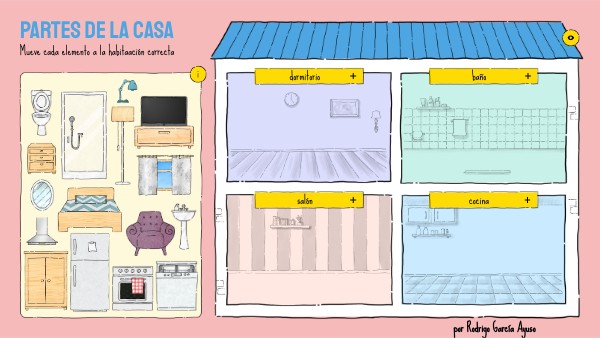 Arrastra y suelta cada mueble u objeto hasta la habitación correcta en la que se deben encontrar. Pista: A cada habitación le corresponden 4 elementos.