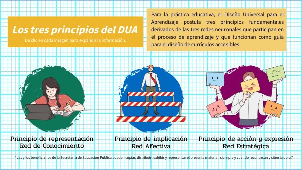Para la práctica educativa, el Diseño Universal para el Aprendizaje postula tres principios fundamentales derivados de las tres redes neuronales que participan en el proceso de aprendizaje y que funcionan como guía para el diseño de currículos accesibles.