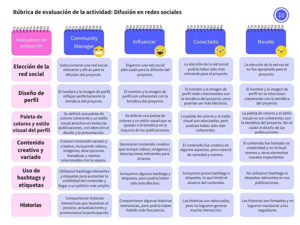 Rúbrica de evaluación de la actividad: Difusión en redes sociales