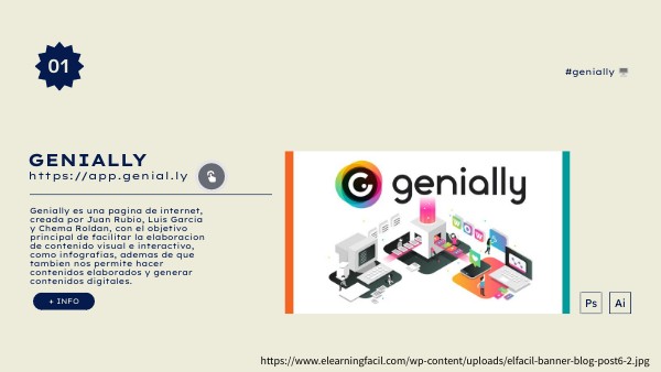 Genially es una pagina de internet, creada por Juan Rubio, Luis Garcia y Chema Roldan, con el objetivo principal de facilitar la elaboracion de contenido visual e interactivo, como infografias, ademas de que tambien nos permite hacer contenidos elaborados y generar contenidos digitales.