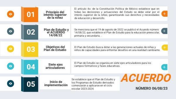 Estos puntos destacan los aspectos clave del texto, que giran en torno a la implementación de un nuevo Plan de Estudio en el sistema educativo de México, con énfasis en el interés superior de la niñez, la formación integral de los estudiantes y la promoción de la equidad.