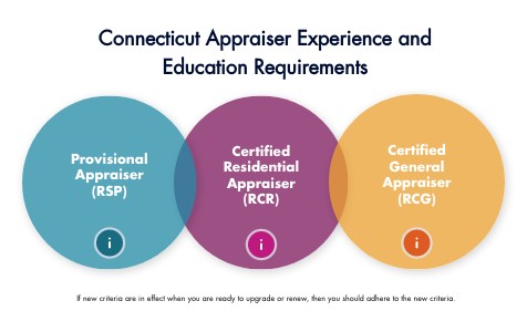 College Education: None Appraisal Education: Must complete required courses — USPAP, Appraisal Practices, Appraisal Procedures and the CT Appraisal Law module. Experience: None Examination: None, but must pass appraisal course exams