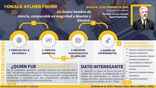 Infografía en horizontal Bibliografía: Infante-Gil, S. (2007). Ronald Aylmer Fisher y la agronomía. Revista Fitotecnia Mexicana, 30(3), 205-205. ; Talacko, J. (1962). Profesor Ronald A. Fisher: Su vida, trabajos y publicaciones. ; Yates, F., & M