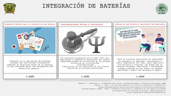 Heredia, C., Santaella, G. & Somarriba Rocha (2012). Informe psicológico. Facultad de psicología, UNAM Tosqui, C. (2015). Los test psicológicos y la ética en su aplicación. Recuperado de https://www.gestiopolis.com/los-test-psicologicos-y-la-etica-en-su-aplicacion/ Alcantar Negrete, Osebel. (2006). "Propuesta critica para la integración de una batería de pruebas psicológicas para la selección de personal. UNAM Recuperado de https://repositorio.unam.mx/contenidos/344147