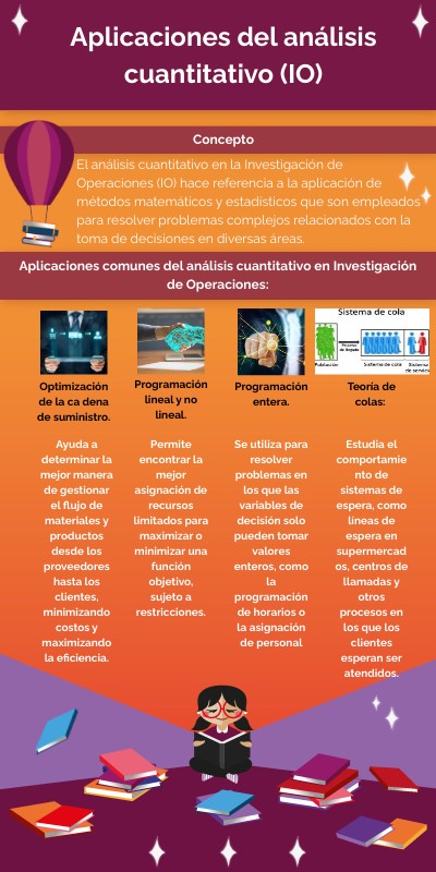 El análisis cuantitativo en la Investigación de Operaciones (IO) hace referencia a la aplicación de métodos matemáticos y estadísticos que son empleados para resolver problemas complejos relacionados con la toma de decisiones en diversas áreas.