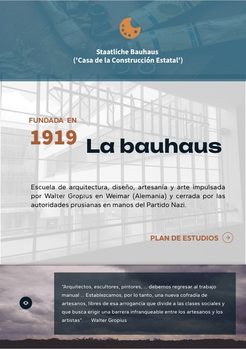 Escuela de arquitectura, diseño, artesanía y arte impulsada por Walter Gropius en Weimar (Alemania) y cerrada por las autoridades prusianas en manos del Partido Nazi.