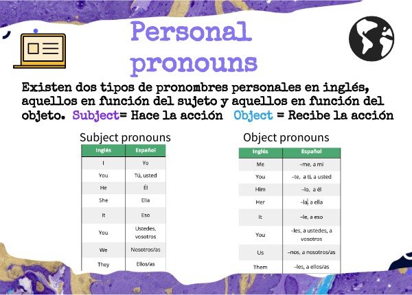 Existen dos tipos de pronombres personales en inglés, aquellos en función del sujeto y aquellos en función del objeto. Subject= Hace la acción Object = Recibe la acción