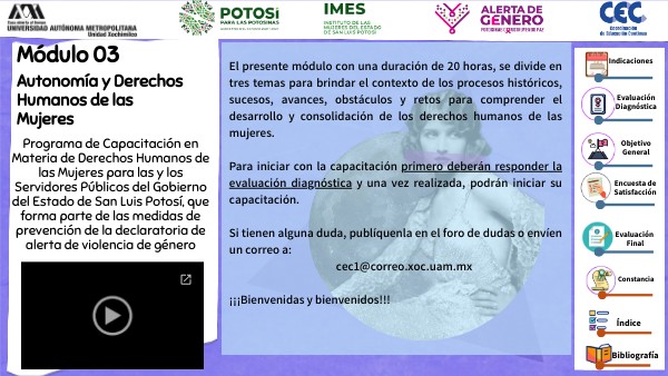 El presente módulo con una duración de 20 horas, se divide en tres temas para brindar el contexto de los procesos históricos, sucesos, avances, obstáculos y retos para comprender el desarrollo y consolidación de los derechos humanos de las mujeres. Para iniciar con la capacitación primero deberán responder la evaluación diagnóstica y una vez realizada, podrán iniciar su capacitación. Si tienen alguna duda, publíquenla en el foro de dudas o envíen un correo a: cec1@correo.xoc.uam.mx ¡¡¡Bienvenidas y bienvenidos!!!