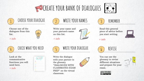 Write the dialogue with your partner in the glossary "DIALOGUES WITH CLASSMATES-EXAM PREP" on the virtual classroom.