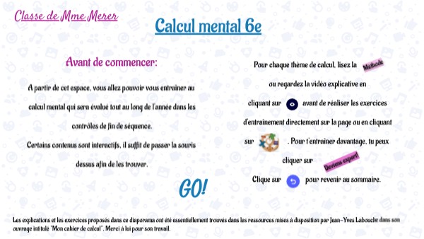 A partir de cet espace, vous allez pouvoir vous entraîner au calcul mental qui sera évalué tout au long de l'année dans les contrôles de fin de séquence. Certains contenus sont interactifs, il suffit de passer la souris dessus afin de les trouver.