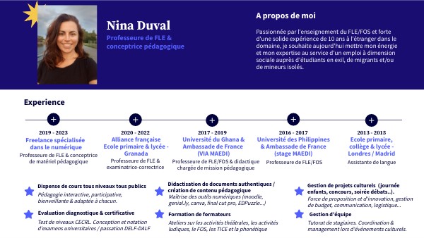 Passionnée par l'enseignement du FLE/FOS et forte d'une solide expérience de 10 ans à l'étranger dans le domaine, je souhaite aujourd'hui mettre mon énergie et mon expertise au service d'un emploi à dimension sociale auprès d'étudiants en exil, de migrants et/ou de mineurs isolés.