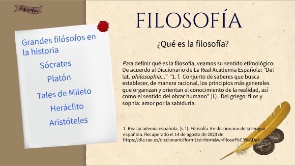 1. Real academia española. (s.f.). Filosofía. En diccionario de la lengua española. Recuperado el 14 de agosto de 2023 de https://dle.rae.es/diccionario?formList=form&w=filosof%C3%ADa#