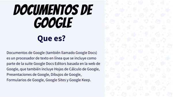 Documentos de Google (también llamado Google Docs) es un procesador de texto en línea que se incluye como parte de la suite Google Docs Editors basada en la web de Google, que también incluye Hojas de Cálculo de Google, Presentaciones de Google, Dibujos de Google, Formularios de Google, Google Sites y Google Keep.