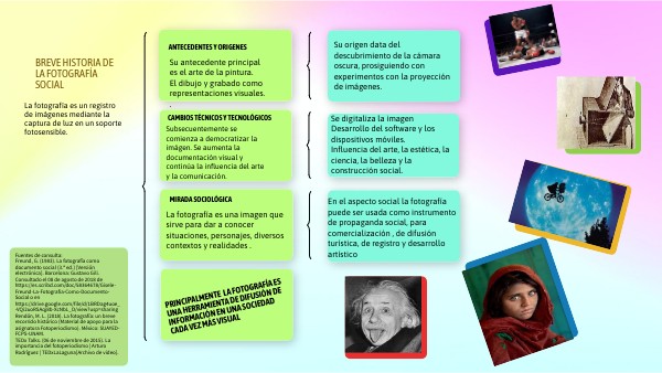 Fuentes de consulta: Freund, G. (1983). La fotografía como documento social (3.ª ed.) [Versión electrónica]. Barcelona: Gustavo Gili. Consultado el 08 de agosto de 2018 de https://es.scribd.com/doc/58364678/Gisele-Freund-La-Fotografia-Como-Documento-Social o en https://drive.google.com/file/d/1BRDag4uoe_-VQi2uoRSAqj8b-XcNbL_O/view?usp=sharing Rendón, M. L. (2018). La fotografía: un breve recorrido histórico (Material de apoyo para la asignatura Fotoperiodismo). México: SUAYED-FCPS-UNAM. TEDx Talks. (06 de noviembre de 2015). La importancia del fotoperiodismo | Arturo Rodríguez | TEDxLaLaguna[Archivo de video].