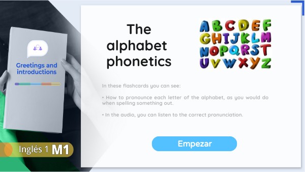 In these flashcards you can see: • How to pronounce each letter of the alphabet, as you would do when spelling something out. • In the audio, you can listen to the correct pronunciation.