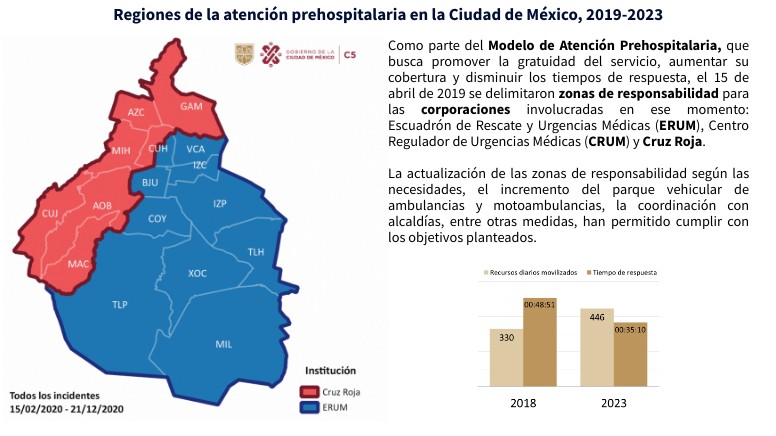 Como parte del Modelo de Atención Prehospitalaria, que busca promover la gratuidad del servicio, aumentar su cobertura y disminuir los tiempos de respuesta, el 15 de abril de 2019 se delimitaron zonas de responsabilidad para las corporaciones involucradas en ese momento: Escuadrón de Rescate y Urgencias Médicas (ERUM), Centro Regulador de Urgencias Médicas (CRUM) y Cruz Roja. La actualización de las zonas de responsabilidad según las necesidades, el incremento del parque vehicular de ambulancias y motoambulancias, la coordinación con alcaldías, entre otras medidas, han permitido cumplir con los objetivos planteados.
