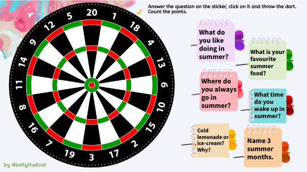Answer the question on the sticker, click on it and throw the dart. Count the points.