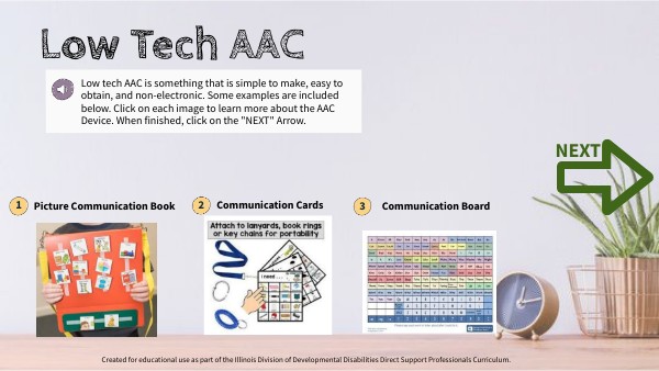 Low tech AAC is something that is simple to make, easy to obtain, and non-electronic. Some examples are included below. Click on each image to learn more about the AAC Device. When finished, click on the "NEXT" Arrow.