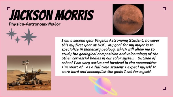 I am a second year Physics Astronomy Student, however this my first year at UCF. My goal for my major is to specialize in planetary geology, which will allow me to study the geological composition and volcanology of the other terrestial bodies in our solar system. Outside of school I am very active and involved in the communites I'm apart of. As a full time student I expect myself to work hard and accomplish the goals I set for myself.