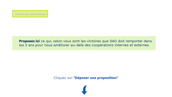 Proposez ici ce qui, selon vous sont les victoires que DAO doit remporter dans les 3 ans pour nous améliorer au-delà des coopérations internes et externes.