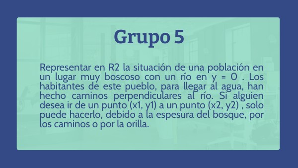Representar en R2 la situación de una población en un lugar muy boscoso con un río en y = 0 . Los habitantes de este pueblo, para llegar al agua, han hecho caminos perpendiculares al río. Si alguien desea ir de un punto (x1, y1) a un punto (x2, y2) , solo puede hacerlo, debido a la espesura del bosque, por los caminos o por la orilla.