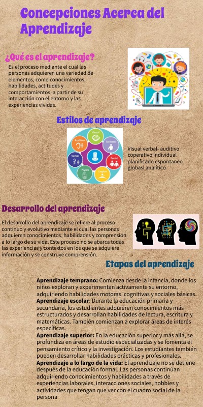 Aprendizaje temprano: Comienza desde la infancia, donde los niños exploran y experimentan activamente su entorno, adquiriendo habilidades motoras, cognitivas y sociales básicas. Aprendizaje escolar: Durante la educación primaria y secundaria, los estudiantes adquieren conocimientos más estructurados y desarrollan habilidades de lectura, escritura y matemáticas. También comienzan a explorar áreas de interés específicas. Aprendizaje superior: En la educación superior y más allá, se profundiza en áreas de estudio especializadas y se fomenta el pensamiento crítico y la investigación. Los estudiantes también pueden desarrollar habilidades prácticas y profesionales. Aprendizaje a lo largo de la vida: El aprendizaje no se detiene después de la educación formal. Las personas continúan adquiriendo conocimientos y habilidades a través de experiencias laborales, interacciones sociales, hobbies y actividades que tengan que ver con el cuadro social de la persona