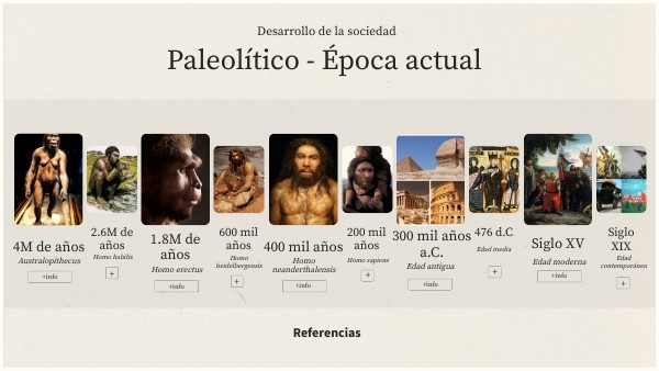 Evolución del hombre - Concepto y etapas. (2013). Concepto. https://concepto.de/evolucion-del-hombre/#:~:text=La%20evoluci%C3%B3n%20humana%20u%20hominizaci%C3%B3n,la%20conocemos%20(Homo%20sapiens). Etapas de la historia: resumen explicado | Twinkl - Twinkl. (2023). Twinkl. https://www.twinkl.es/teaching-wiki/etapas-de-la-historia Kiss, T. (2018, August 15). Homo erectus: historia, subespecies y características. Enciclopedia Humanidades; Enciclopedia Humanidades. https://humanidades.com/homo-erectus/ Fischer, A. (2022, October 19). Encuentran una misteriosa especie de humano prehistórico en una cueva de Polonia - National Geographic en Español. National Geographic En Español. https://www.ngenespanol.com/animales/como-era-el-homo-heidelbergensis/