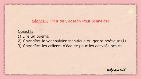 Objectifs : 1) Lire un poème 2) Connaître le vocabulaire technique du genre poétique (1) 3) Connaître les critères d'écoute pour les activités orales