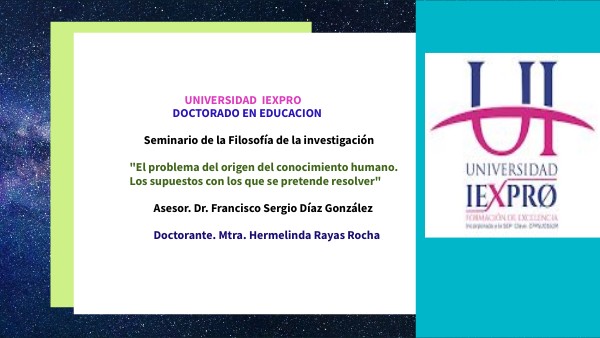 UNIVERSIDAD IEXPRO DOCTORADO EN EDUCACION Seminario de la Filosofía de la investigación "El problema del origen del conocimiento humano. Los supuestos con los que se pretende resolver" Asesor. Dr. Francisco Sergio Díaz González Doctorante. Mtra. Hermelinda Rayas Rocha