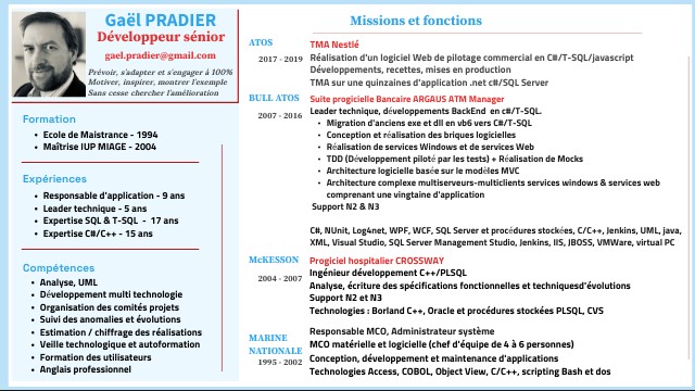 Responsable MCO, Administrateur systèmeMCO matérielle et logicielle (chef d'équipe de 4 à 6 personnes) Conception, développement et maintenance d'applications Technologies Access, COBOL, Object View, C/C++, scripting Bash et DOS