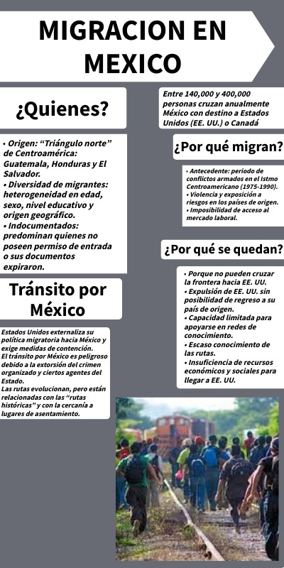 Estados Unidos externaliza su política migratoria hacia México y exige medidas de contención. El tránsito por México es peligroso debido a la extorsión del crimen organizado y ciertos agentes del Estado. Las rutas evolucionan, pero están relacionadas con las “rutas históricas” y con la cercanía a lugares de asentamiento.