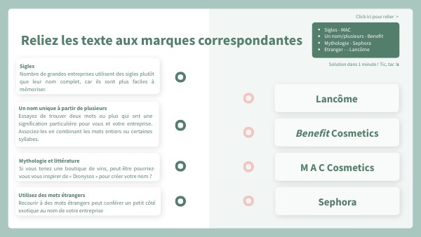 Un nom unique à partir de plusieurs Essayez de trouver deux mots ou plus qui ont une signification particulière pour vous et votre entreprise. Associez-les en combinant les mots entiers ou certaines syllabes.
