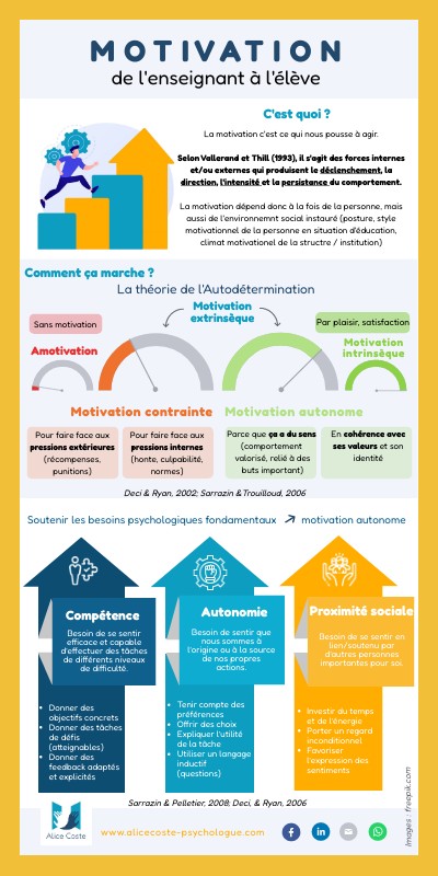 La motivation c'est ce qui nous pousse à agir. Selon Vallerand et Thill (1993), il s'agit des forces internes et/ou externes qui produisent le déclenchement, la direction, l'intensité et la persistance du comportement. La motivation dépend donc à la fois de la personne, mais aussi de l'environnemnt social instauré (posture, style motivationnel de la personne en situation d'éducation, climat motivationel de la structre / institution)