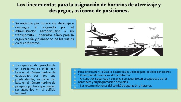 Los lineamientos para la asignación de horarios de aterrizaje y despegue, así como de posiciones.