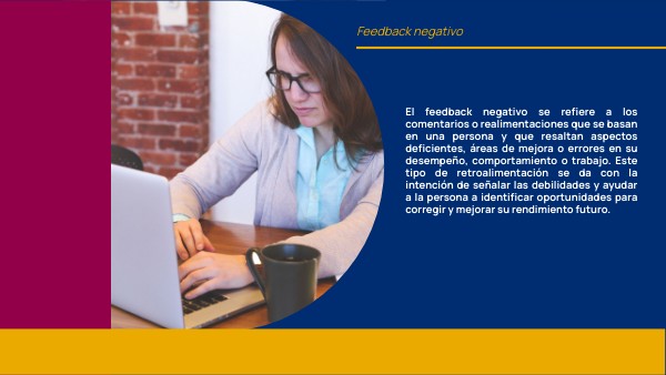 • Aunque es negativo, el feedback se debe presentar de manera constructiva y orientada hacia la mejora, en lugar de ser simplemente crítico o despectivo. • El feedback negativo debe ser específico y con ejemplos concretos para que la persona comprenda claramente qué aspectos necesitan mejorarse. • Es importante que el feedback se base en observaciones objetivas y no en opiniones personales. Debe estar respaldado por evidencia concreta. • El feedback negativo se centra en el comportamiento, acciones o resultados, no en la personalidad o carácter de la persona. • A pesar de ser crítico, el feedback negativo tiene como objetivo ayudar a la persona a desarrollar habilidades y superar obstáculos, lo que contribuye a su crecimiento.