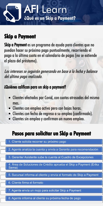 Skip a Payment es un programa de ayuda para clientes que no puedan hacer su próximo pago puntualmente, recorriendo el pago a la última cuota en el calendario de pagos (no se extiende el plazo del préstamo). Los intereses se seguirán generando en base a la fecha y balance del último pago realizado. ¿Quiénes califican para un skip a payment? - Clientes afectados por Covid, con cuotas atrasadas del mismo mes.