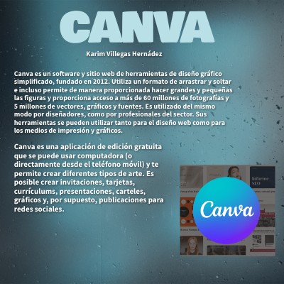Canva es un software y sitio web de herramientas de diseño gráfico simplificado, fundado en 2012. Utiliza un formato de arrastrar y soltar e incluso permite de manera proporcionada hacer grandes y pequeñas las figuras y proporciona acceso a más de 60 millones de fotografías y 5 millones de vectores, gráficos y fuentes. Es utilizado del mismo modo por diseñadores, como por profesionales del sector. Sus herramientas se pueden utilizar tanto para el diseño web como para los medios de impresión y gráficos.