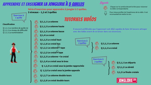 Série d’exercices pour apprendre à jongler à 3 quilles.3 niveaux – 1,2 et 3 quilles