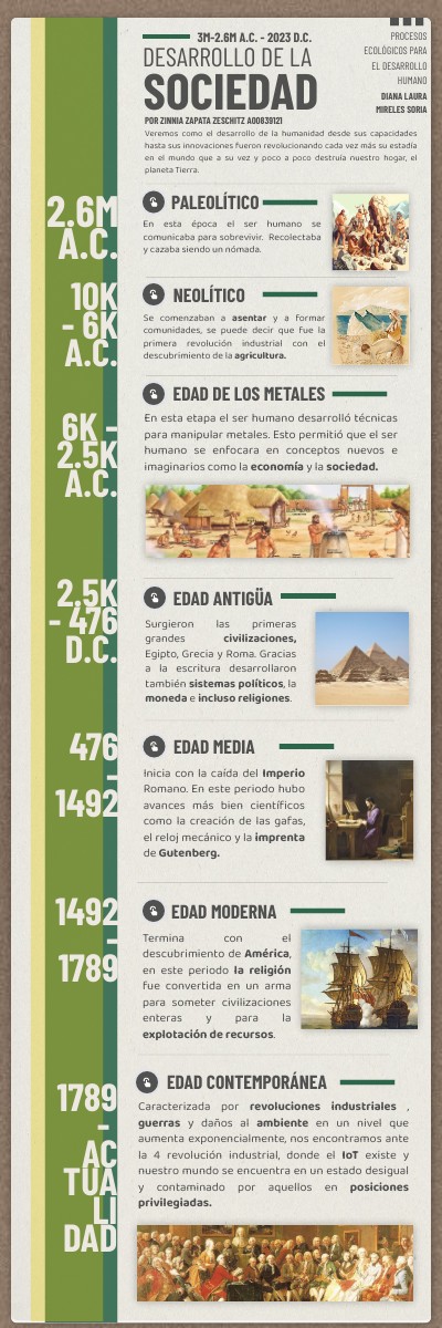 Fundación Palarq. (2021, 13 septiembre). ¿Cuándo empezó la edad de los metales? [Vídeo]. YouTube. https://www.youtube.com/watch?v=5GINzejN2I0GM, A. (2020, 23 enero). 6 inventos medievales que cambiaron el mundo. historia.nationalgeographic.com.es. https://historia.nationalgeographic.com.es/a/6-inventos-medievales-que-cambiaron-mundo_15075 Kiss, T. (2022a). Edad antigua: etapas, culturas, elementos y características. Enciclopedia Humanidades. https://humanidades.com/edad-antigua/ Kiss, T. (2023). Democracia ateniense: información, funciones y características. Enciclopedia Humanidades. https://humanidades.com/democracia-ateniense/ Leskow, E. C. (2021). Leyes de Newton: definición, fundamentos y características. Enciclopedia Humanidades. https://humanidades.com/leyes-de-newton/ Lifeder Educación. (2018, 21 diciembre). La EDAD ANTIGUA explicada: origen, características y acontecimientos importantes 📜 [Vídeo]. YouTube. https://www.youtube.com/watch?v=09kyKcr3Lyw Luzón, A. F. (2021, 26 marzo). Gutenberg: el inventor que cambió el mundo. historia.nationalgeographic.com.es. https://historia.nationalgeographic.com.es/a/gutenberg-inventor-que-cambio-mundo_11140 Memorias de Pez. (2023, 6 marzo). ✅ La EDAD CONTEMPORÁNEA en 15 minutos | Resumen fácil y divertido [Vídeo]. YouTube. https://www.youtube.com/watch?v=TZsIM74cFbk Msuaump. (2016, 5 septiembre). Tema 1 «La prehistoria». Blog de Miguel Ángel Suárez Umpiérrez. https://www3.gobiernodecanarias.org/medusa/ecoblog/msuaump/sociales-2o-eso/tema-7-la-prehistoria/ Reportajes y fotografías de edad Media en National Geographic Historia. (s. f.). historia.nationalgeographic.com.es. https://historia.nationalgeographic.com.es/temas/edad-media Reportajes y fotografías de edad moderna en National Geographic Historia. (s. f.). historia.nationalgeographic.com.es. https://historia.nationalgeographic.com.es/temas/edad-moderna Reportajes y fotografías de prehistoria en National Geographic Historia. (s. f.). historia.nationalgeographic.com.es. https://historia.nationalgeographic.com.es/temas/prehistoria SERVIMEDIA. (2018, 6 junio). Los humanos ya contaminaban hace 5.600 a os. ELMUNDO. https://www.elmundo.es/vida-sana/bienestar/2018/06/06/5b166cd5e2704e3d248b4578.html spanishexplorer74. (2021, 8 enero). DOCUMENTAL «Armas, gérmenes y acero» (2004) adaptación del libro de Jared Diamond [Vídeo]. YouTube. https://www.youtube.com/watch?v=gVM_HwW7r4A Universal, H. (2022). La prehistoria. Historia Universal. https://mihistoriauniversal.com/prehistoria/prehistoria VisualEconomik EN. (2023, 25 junio). DEGROWTH: Destroying the economy to save the planet? [Vídeo]. YouTube. https://www.youtube.com/watch?v=edyMiMXzYRU