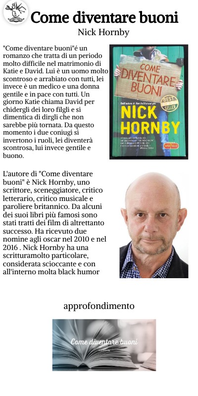 L'autore di "Come diventare buoni" è Nick Hornby, uno scrittore, sceneggiatore, critico letterario, critico musicale e paroliere britannico. Da alcuni dei suoi libri più famosi sono stati tratti dei film di altrettanto successo. Ha ricevuto due nomine agli oscar nel 2010 e nel 2016 . Nick Hornby ha una scritturamolto particolare, considerata scioccante e con all'interno molta black humor