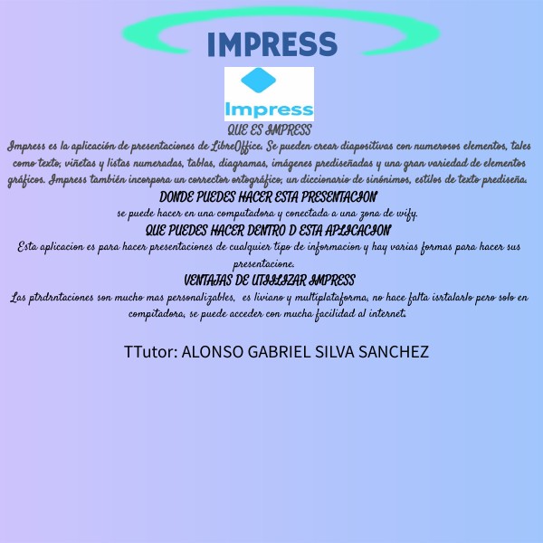 QUE ES IMPRESSImpress es la aplicación de presentaciones de LibreOffice. Se pueden crear diapositivas con numerosos elementos, tales como texto, viñetas y listas numeradas, tablas, diagramas, imágenes prediseñadas y una gran variedad de elementos gráficos. Impress también incorpora un corrector ortográfico, un diccionario de sinónimos, estilos de texto prediseña. DONDE PUEDES HACER ESTA PRESENTACION se puede hacer en una computadora y conectada a una zona de wify. QUE PUEDES HACER DENTRO D ESTA APLICACION Esta aplicacion es para hacer presentaciones de cualquier tipo de informacion y hay varias formas para hacer sus presentacione. VENTAJAS DE UTIILIZAR IMPRESS Las ptrdrntaciones son mucho mas personalizables, es liviano y multiplataforma, no hace falta isrtalarlo pero solo en compitadora, se puede acceder con mucha facilidad al internet.