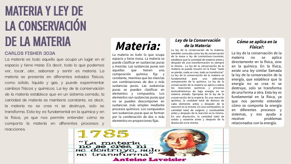 La ley de la conservación de la materia, también conocida como ley de conservación de la masa o ley de Lomonósov-Lavoisier, establece que la cantidad de materia antes y después de una transformación es siempre la misma . La ley de la conservación de la materia se puede resumir en la frase "nada se pierde, nada se crea, todo se transforma". La ley de la conservación de la materia es fundamental para una adecuada comprensión de la química. La ley de la conservación de la materia se aplica a todas las reacciones químicas y procesos termodinámicos de baja energía en un sistema aislado. Ejemplos de la ley de la conservación de la materia: En una reacción química, la cantidad total de átomos de cada elemento antes y después de la reacción es la misma. En una combustión, la cantidad total de oxígeno y combustible antes y después de la reacción es la misma. En una disolución, la cantidad total de soluto y solvente antes y después de la disolución es la misma.